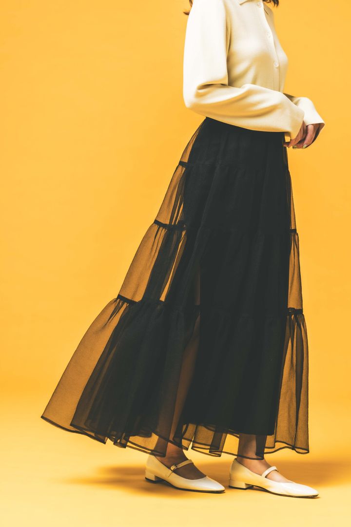 3段のティアードとたっぷりあしらったオーガンジーで、ふわっとドラマティックに着こなせるフレアスカート。透け感のあるオーガンジーならダークカラーも重くなり過ぎず季節つなぎにぴったり。こちらのフレアスカートはインナーに深めのスリット入りなのでより軽快な印象に仕上がります。
