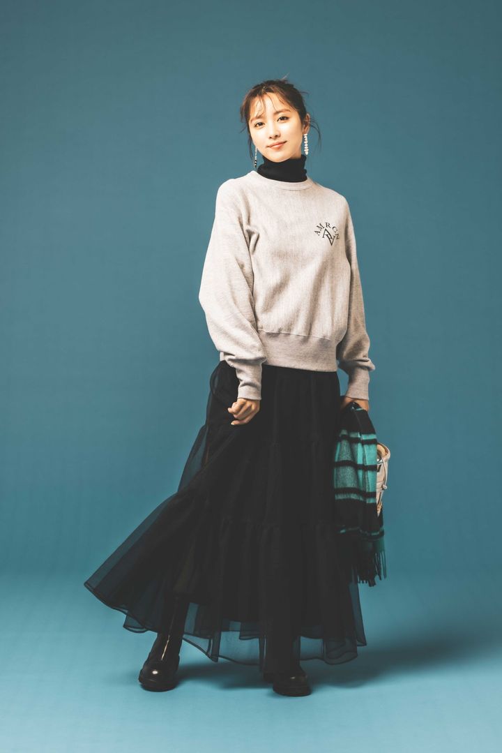 オーガンジースカート¥39,600(ウィム ガゼット/ウィム ガゼット ルミネ新宿店)スウェットトップス¥15,400〈アメリカーナ×ジーンズ ファクトリー〉タートルカットソー¥5,390〈ロバートピーミラー×ジーンズ ファクトリー〉(ともにジーンズ ファクトリー 卸団地本店)バッグ¥15,400(ダイアナ/ダイアナ 銀座本店)ストール¥75,900(ジョンストンズ×ハウント別注/ハウント代官山/ゲストリスト)ブーツ¥28,600(カミナンド/グラビテート)ピアス¥11,660(パズ・コレクティブ/ZUTTOHOLIC)