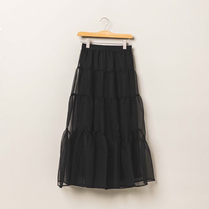 オーガンジースカートが初めてでも挑戦しやすい、ブラックとベーシックなフレアシルエットを嬉しいプライスで!ティアードの切り替えが細かく入っているので、ふわっと動作感まできれいに演出してくれます。