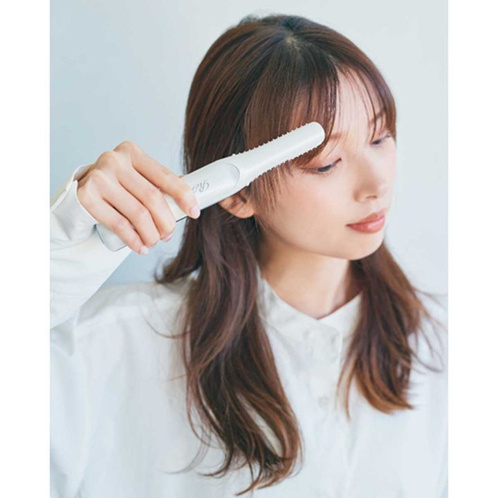 サイドバングのカールが強すぎると不自然になるので、ストレートアイロンで中間を挟んで軽い内巻きになるようにスライドさせます。