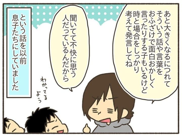 それだけではなく、性の話を聞いていて不快な思いをする人もいることや、時と場合をしっかり考えて発言することなどを含め、周りの子にはまだ言わない方が良いと思う旨も伝えて、他の家庭に配慮もしていました。