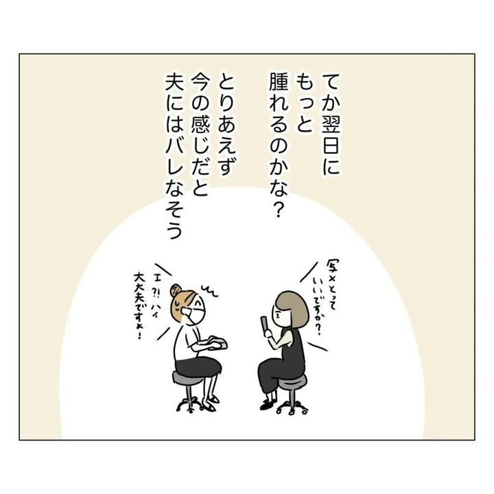 この漫画は、長年目の下のクマに悩んでいた作者・もいもい(@moimoimoi2712)さんが、夫に秘密で美容整形をするお話です。美容整形について、夫と価値観の違いがあるとわかったもいもいさん。長年悩み苦しんできたクマを取るために、反対する夫を説得する必要はないと考え、1人で美容整形を決意。ついに当日、あっという間に手術が終わり、鏡をのぞくと夢に見たクマのない自分の顔があったのでした。『夫に内緒で美容整形した話』第10話をご覧ください。