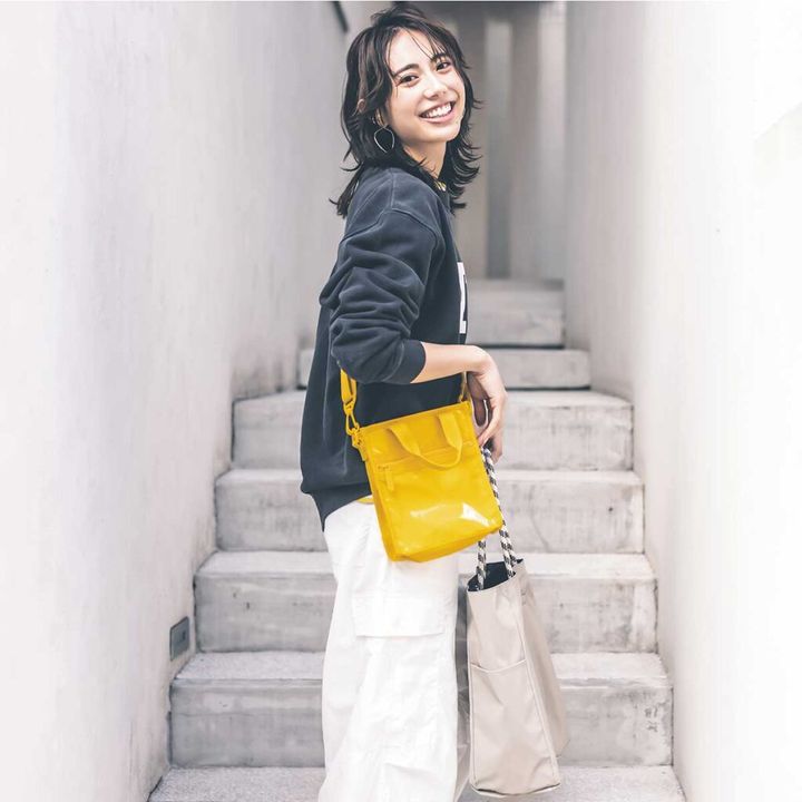 縦型のミニトートは、肩掛けしてもスタイリッシュな印象に。上品なツヤ感がシンプルなワンツーコーデを軽やかに盛り上げます。ミニトートバッグ¥13,200(レスポートサック/買えるCLASSY.)トートバッグ¥20,900(レスポートサック/レスポートサック ジャパン)スウェット¥9,350(バルミーデイズ/UTS PR)パンツ¥13,200(ジーンズ ファクトリー クローズ/ジーンズ ファクトリー 卸団地本店)ピアス¥38,500(マリハ)