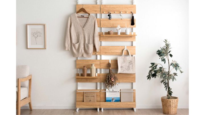 天井と床で突っ張ったフレームに棚を設置し、収納やディスプレイに活用。「タンスのゲン」の突っ張り式ウォールラックは可動棚や2種類のフック、マガジンラックの取り付けが可能。フレームの幅は3種類、カラーリングもナチュラルな白基調からスタイリッシュな黒基調まで3タイプをご用意。何より壁に穴を開けることなく、省スペースなのも勝手がいい。