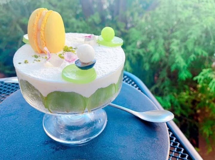 マスカットのスパークリングワインでコンポートしたシャインマスカットと、フロマージュブランのソルベを載せた、さわやかでさっぱりとした味わいのパフェです。