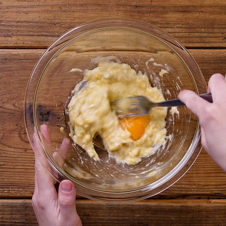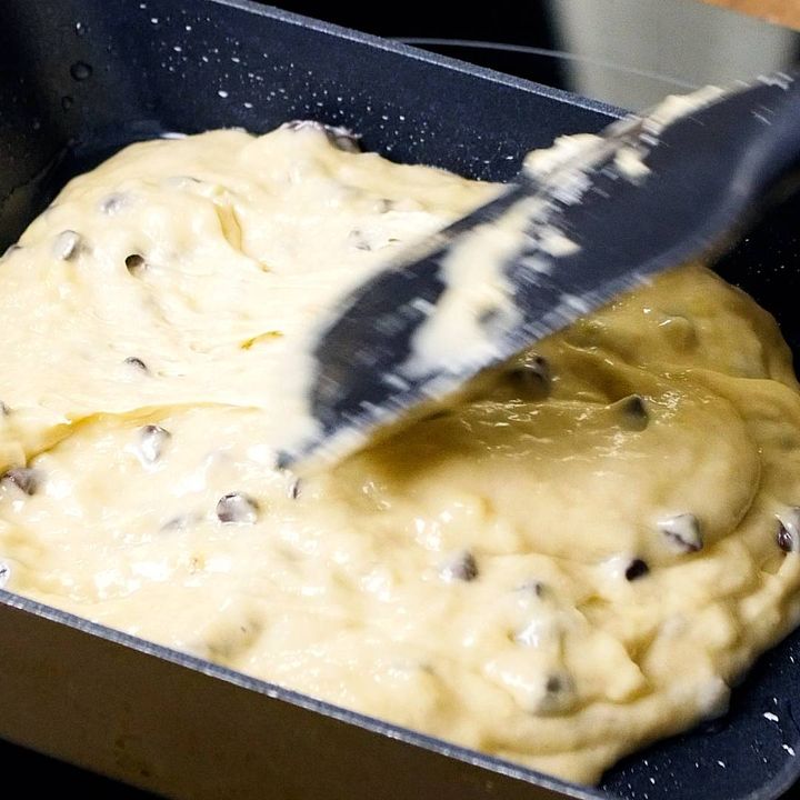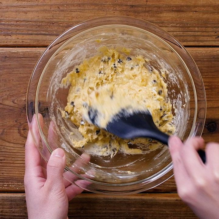3: ホットケーキミックス、チョコチップを加えて粉気がなくなるまで混ぜ合わせます。