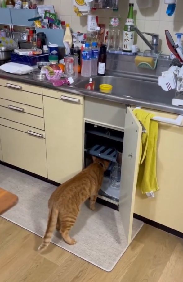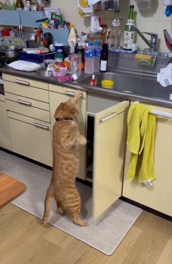 猫がシンク下のキャビネットを開けちゃった!?「言葉を覚えたら家事手伝えますね」「人のやる事、よく見てるよね」