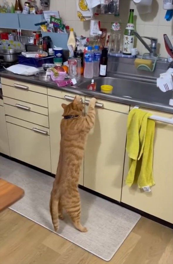 キッチンにやってきた猫。 シンクにつかまり立ちをしているようにも見えましたが・・・、実はある目的があったようなのです!!
