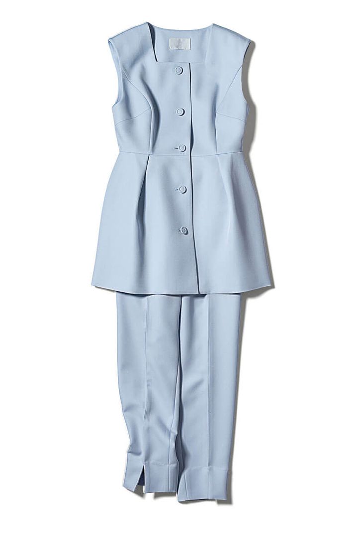 レディなパンツスタイルが叶う構築的な華やかジレとのセット。ウエストをキュッと絞ったぺプラムシルエットがエレガント。手洗い可能でお手入れも楽ちん♪