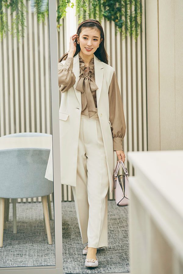 セットアップ対応のロング丈ジレとパンツがスーツ級のきちんと感を演出。フェミニンなアイボリーがレディにマッチ。