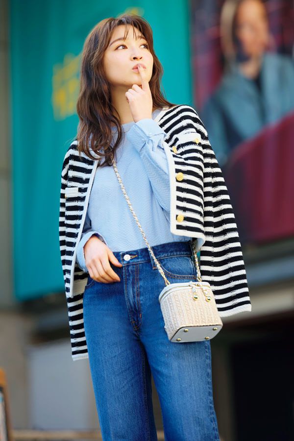 ころんとした形がチャーミングなショルダーバッグを斜め掛けした上に、短め丈のカーデをさらりと肩掛け。配色パイピングや金ボタンなど、ジャケット風ディテールできちんと見せつつ、こなれ感たっぷりの風情に。
