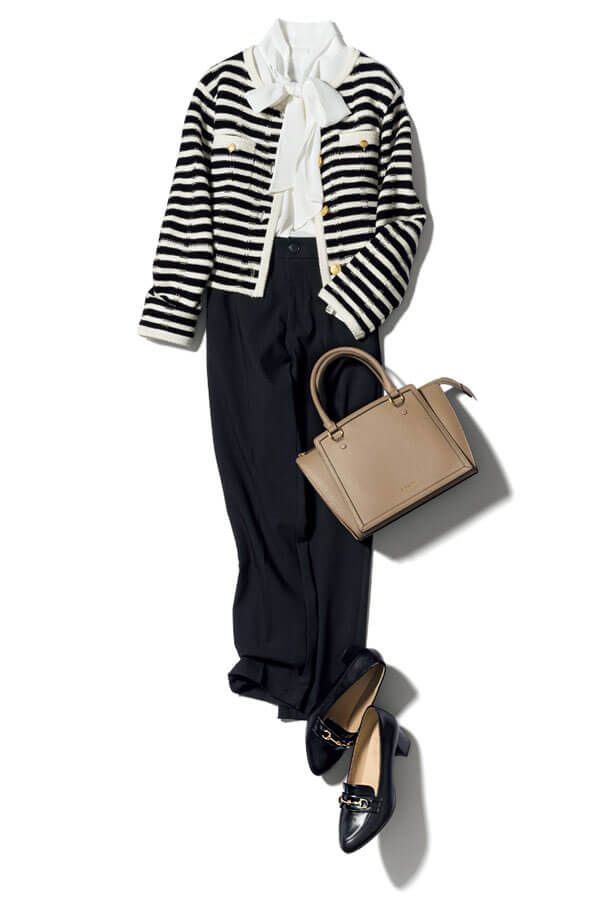 最低気温10度以下ならニットジャケットで寒さ対策。タック入りの端正な黒パンツを、モノトーン配色でとことんシックに。ジャケット風のニットカーデからブラウスのボウタイをのぞかせれば、地味に陥らず華感も申し分ナシです。