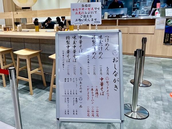 清潔感あふれる白木のナチュラルな明るい店内。大きなカウンターの奥には壁に向けたカウンターや、家族でも楽しめるテーブル席が並びます。注文口でオーダーと会計を先に済ませるフードコート式でした。お冷やスープ割りもセルフ。紙エプロンもありました。
