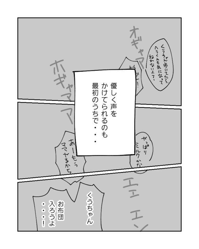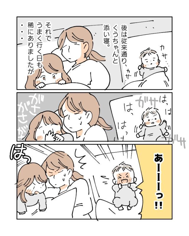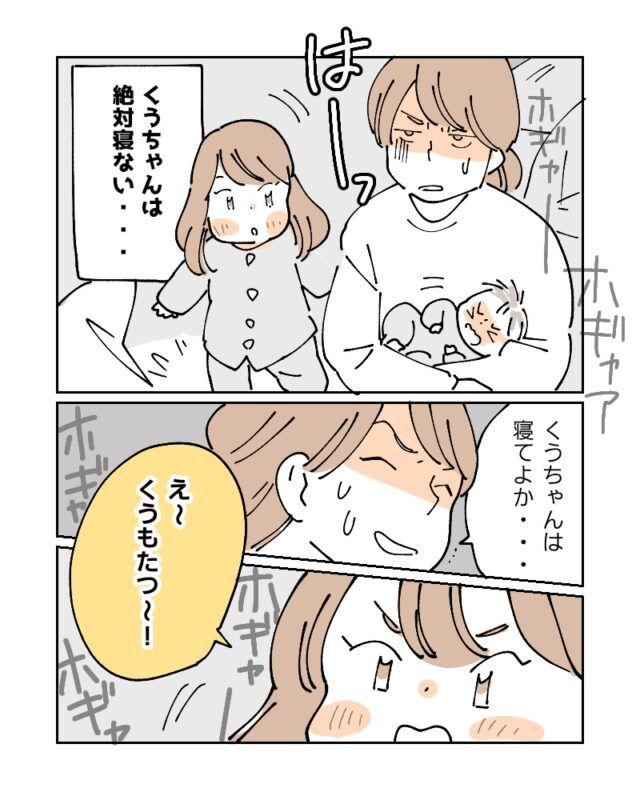 へうくんの泣き声で起き、片手でへうくんを抱っこしながらくうちゃんを寝かしつけることも。