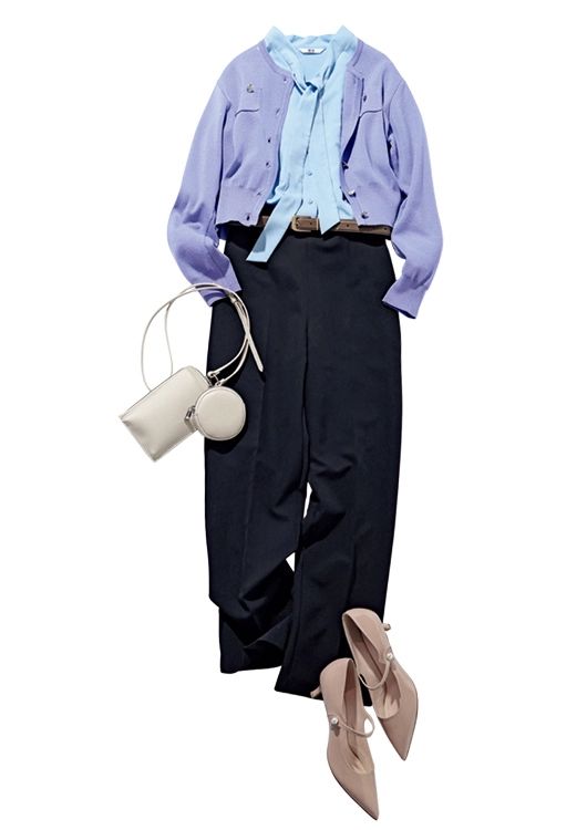 セットアップ(パンツ)¥19,910/ミラ オーウェン ルミネ新宿2店 ニットカーディガン¥18,700/カデュネ ボウタイブラウス¥2,990/UNIQLO ストラップパンプス¥18,700/ダイアナ(ダイアナ 銀座本店) ベルト¥990、ショルダーポーチ¥1,990/ともにGU