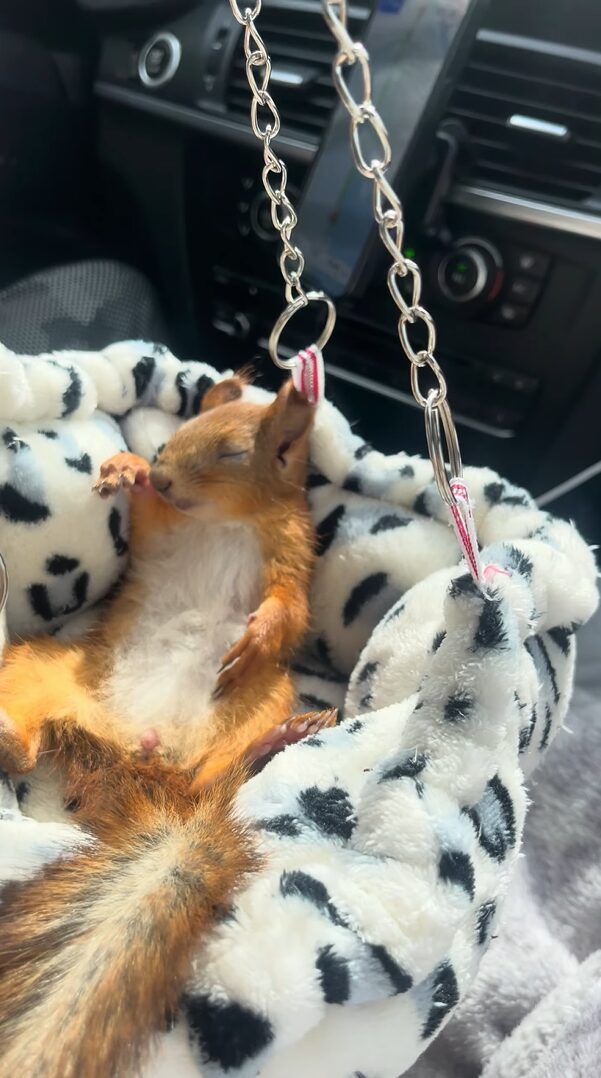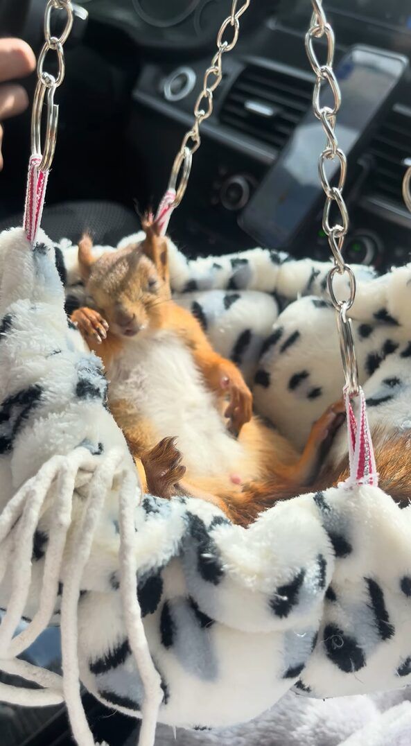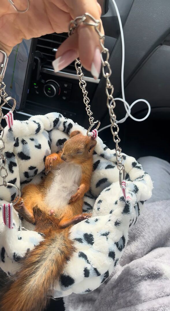 飼い主さんの運転する車の中で、ハンモックベッドでぐっすりと眠っているリス。
