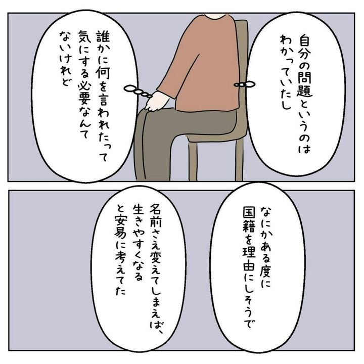 ですがおとさん自身は、就職活動をはじめ、うまくいかない物事を韓国名のせいにしていることもわかっています。国籍のことを言えば、お母さんのことも悲しませると知っています。