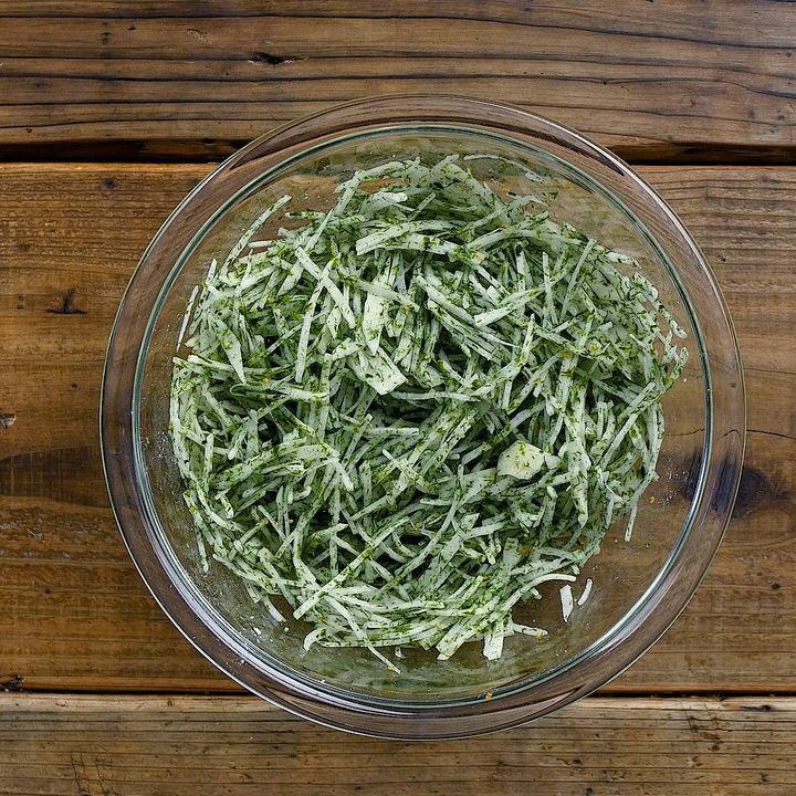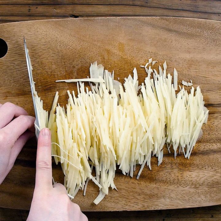 1: じゃがいもを千切りにして水にさらし、しっかりと水気を切ります。