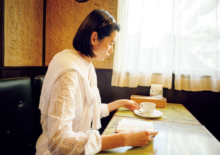 いつもの喫茶店でコーヒー。慣れ親しんだ味にホッとするように、いつ身に着けても自分に馴染んでくれるスタンダードなアイテムを持っておくと安心する。〈アレクサンドル ドゥ パリ〉のカチューシャは飽きのこないパターンで、1.5㎝と太めの幅がアクセント。自然に上品さを加えてくれるから、つい手に取ってしまうのだ。¥16,500(アレクサンドル ドゥ パリ GINZA SIX店 03−6264−5442) ワンピース¥64,900、肩に掛けたニット¥35,200(ともにポロ ラルフ ローレン/ラルフ ローレン 0120-3274-20) その他スタイリスト私物