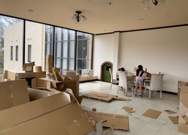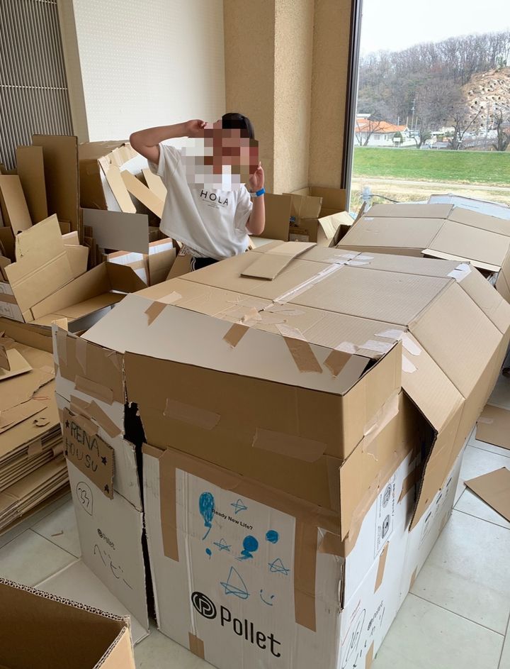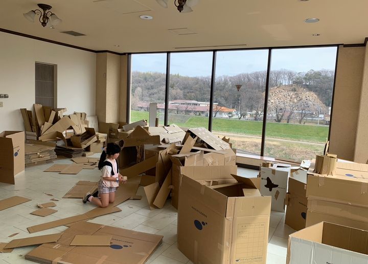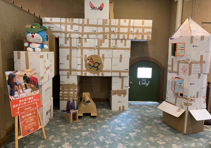 長女はダンボール工作やりたい!と言ってダンボールブースへ。一緒に行くと部屋には沢山のダンボール!