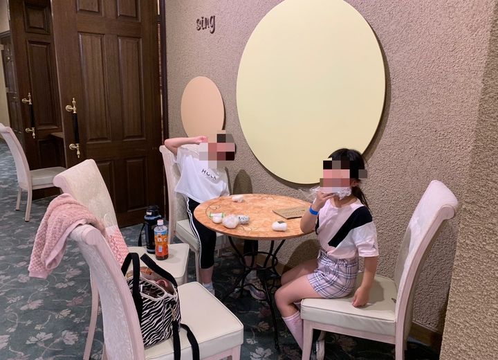 昼食のおにぎりを持ってきたので廊下にあるテーブルと椅子で食事をしました!(廊下は飲食OK)