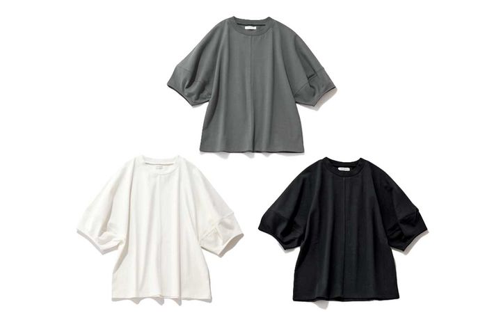 立体的なシルエットに、センターラインを効かせたデザインでTシャツながらもきちんと感が。ダーツの入った立体的なボリューム袖は、二の腕の細見え効果にも一役買います。