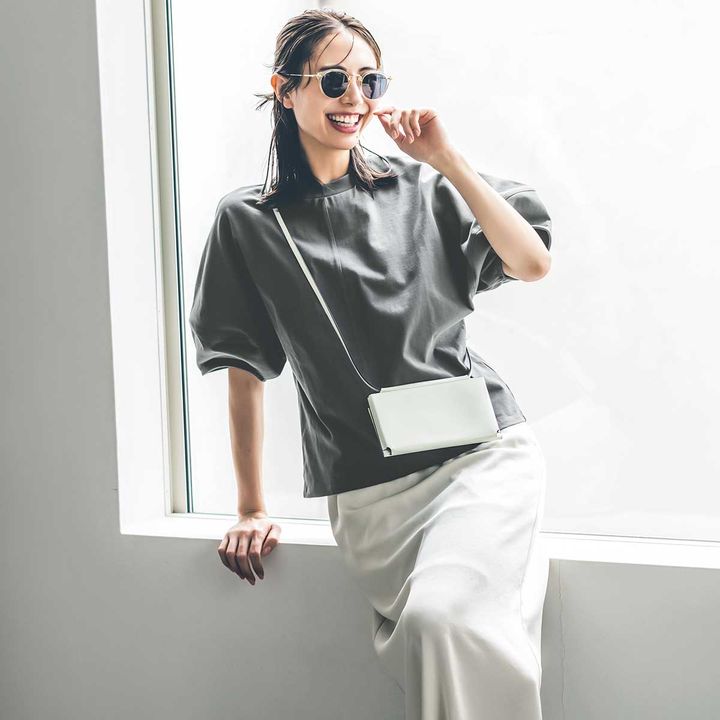 ほどよくハリがある素材のおかげで、シンプルなワンツーコーデもきちんと見える!アウトさせても好バランスに仕上がる優秀シルエット。Tシャツ¥12,100(カーサフライン/買えるCLASSY.)スカート¥18, 700(マイカアンドディール/マイカアンドディール恵比寿店)バッグ¥31,900(オルセット/オルサ)サングラス¥52,800(アイヴァン/アイヴァン東京ギャラリー)