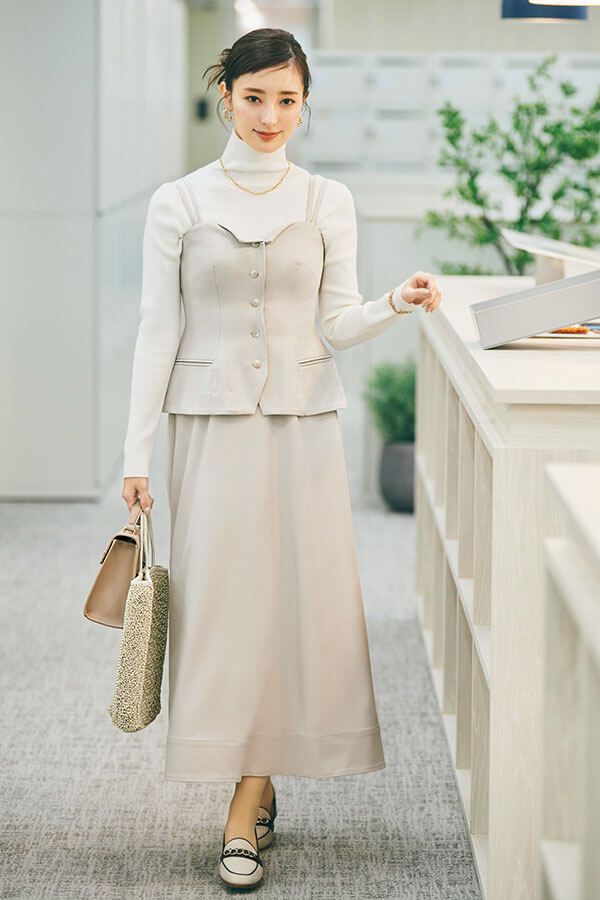 ビスチェとスカートを組み合わせたレイヤード風のワンピなら、オフでも使えてお仕事スタイルもこなれた印象。まろやかワントーンで優しい雰囲気を演出して。
