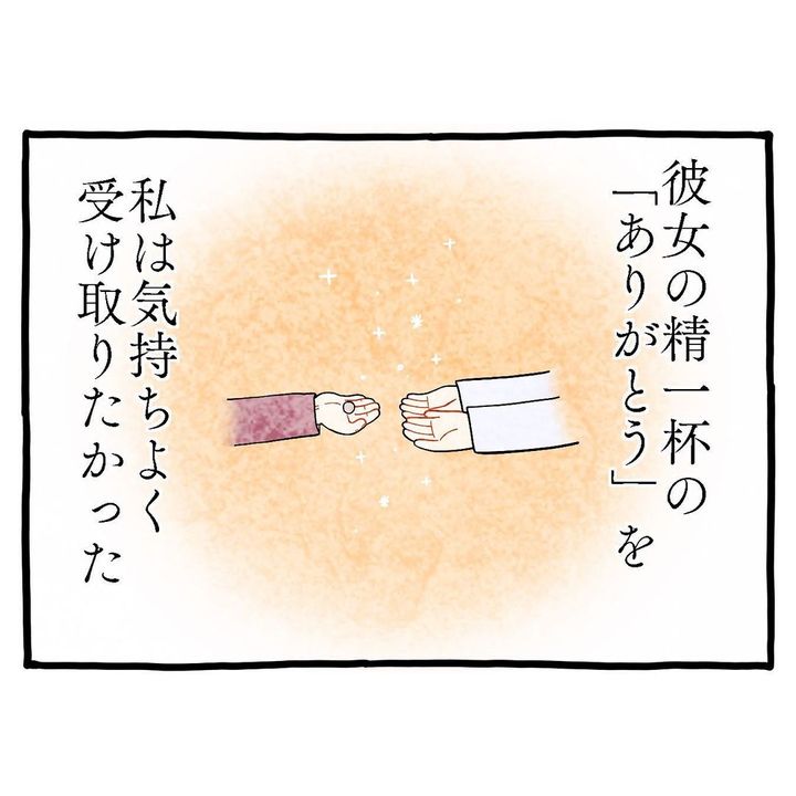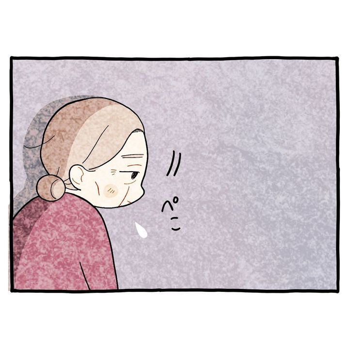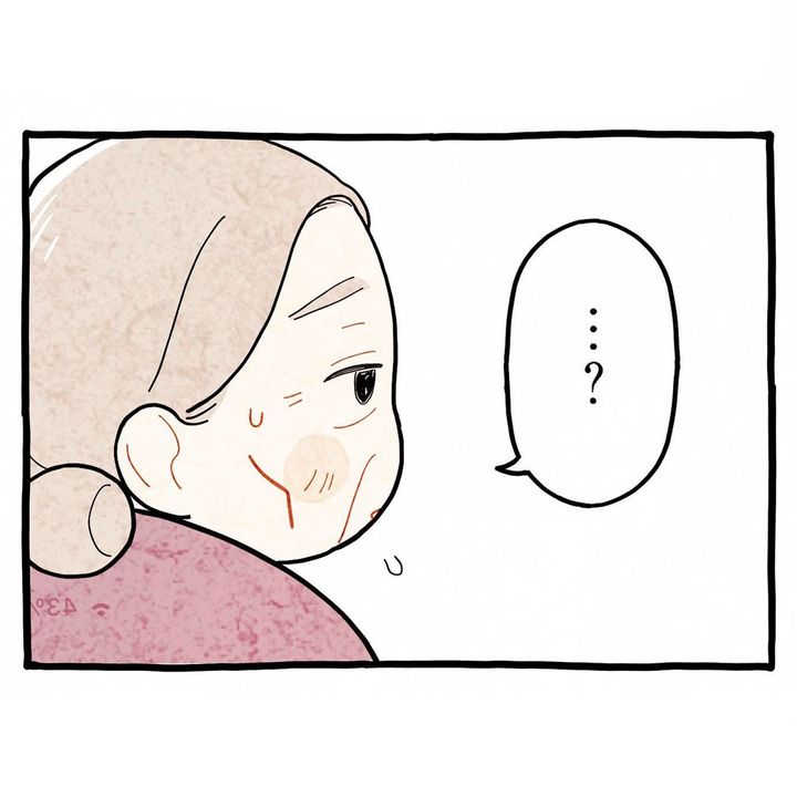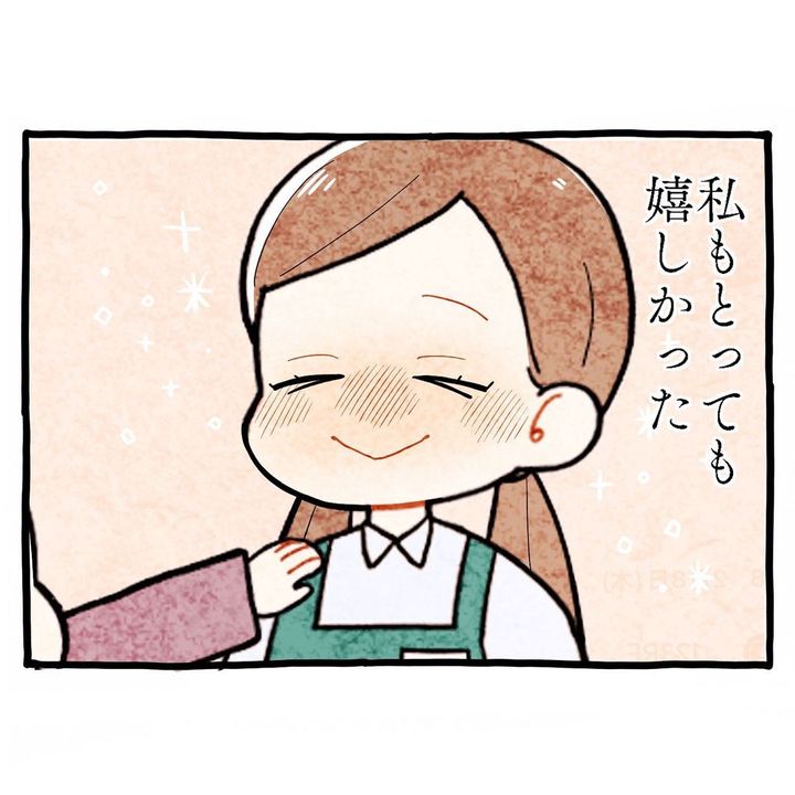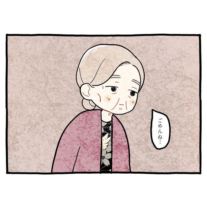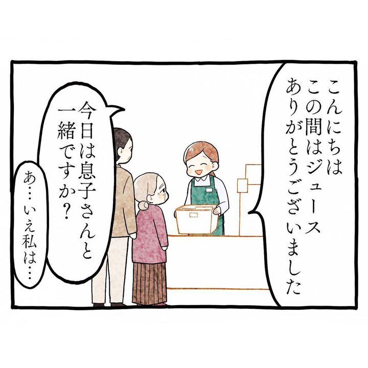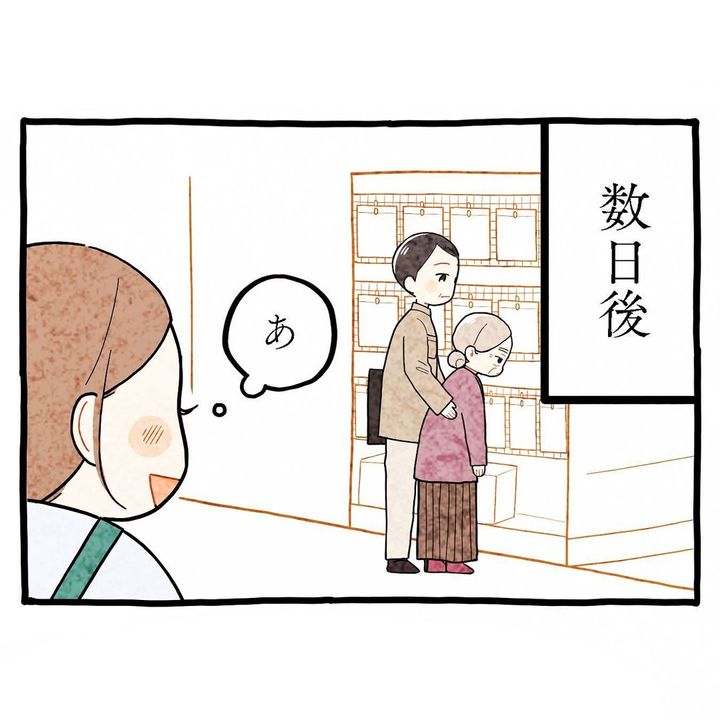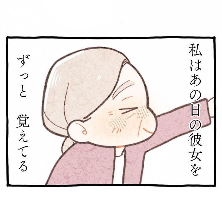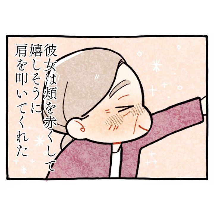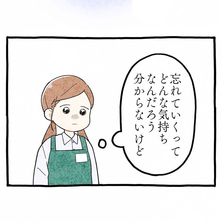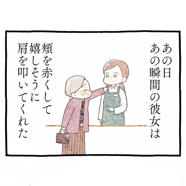 その100円を受け取ると、頬を赤くしながら嬉しそうに肩を叩いてくれたおばあさん…!その数日後、男性に付き添われて来店したおばあさんに、あやさんがジュースのお礼を言うと、覚えていませんでした。そんなおばあさんを見送ったあやさんは、「忘れていくってどんな気持ちなんだろう」と考えながら、嬉しそうに肩を叩いてくれた姿を自分はずっと覚えていると思ったのでした。