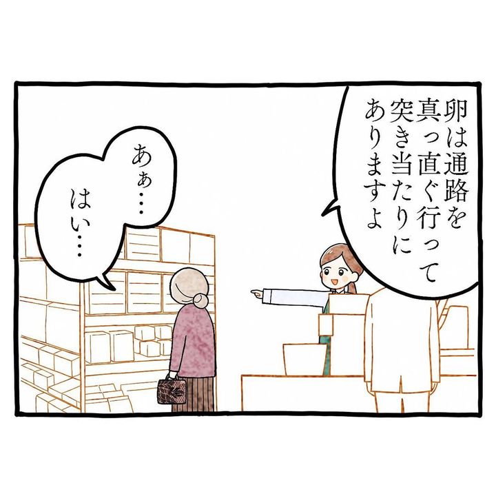 レジ作業中におばあさんから卵の場所を聞かれたあやさん。口頭で場所を伝えますが…?