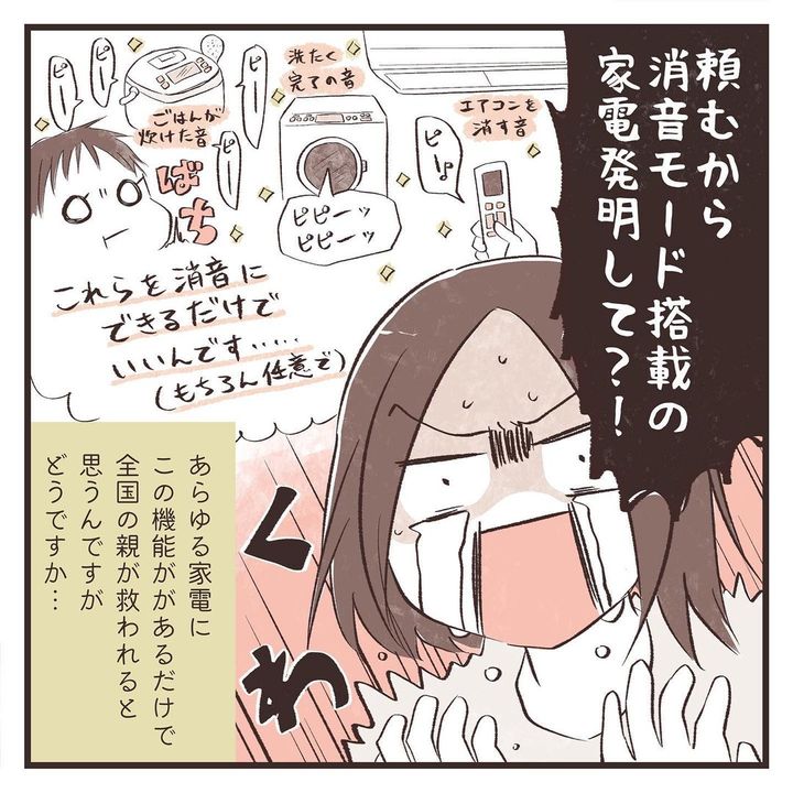 ちなみに、コメント欄に寄せられた情報によると、消音モード搭載の家電は一部発明されているそう。全国のママたちの声が届いたのでしょうか。直接脳に語りかけてくる地域無線や、絶対ギシギシしないマットレスが誕生する日も間近!?