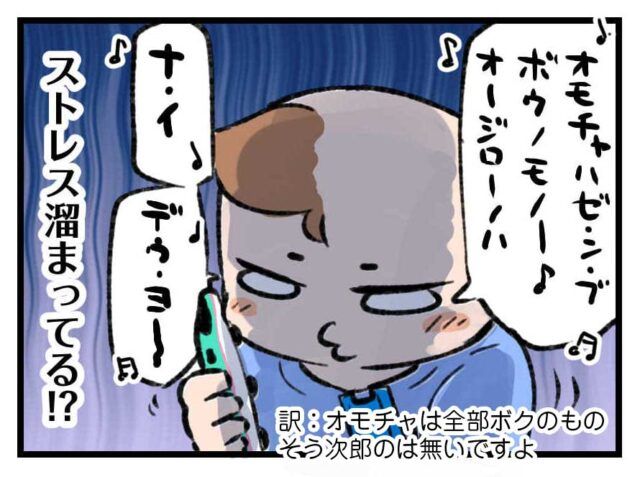 なんか怖いな・・。弟におもちゃを取られた兄の恨み節が部屋中に響き渡る(汗)|左近寺しゅうりの育児漫画