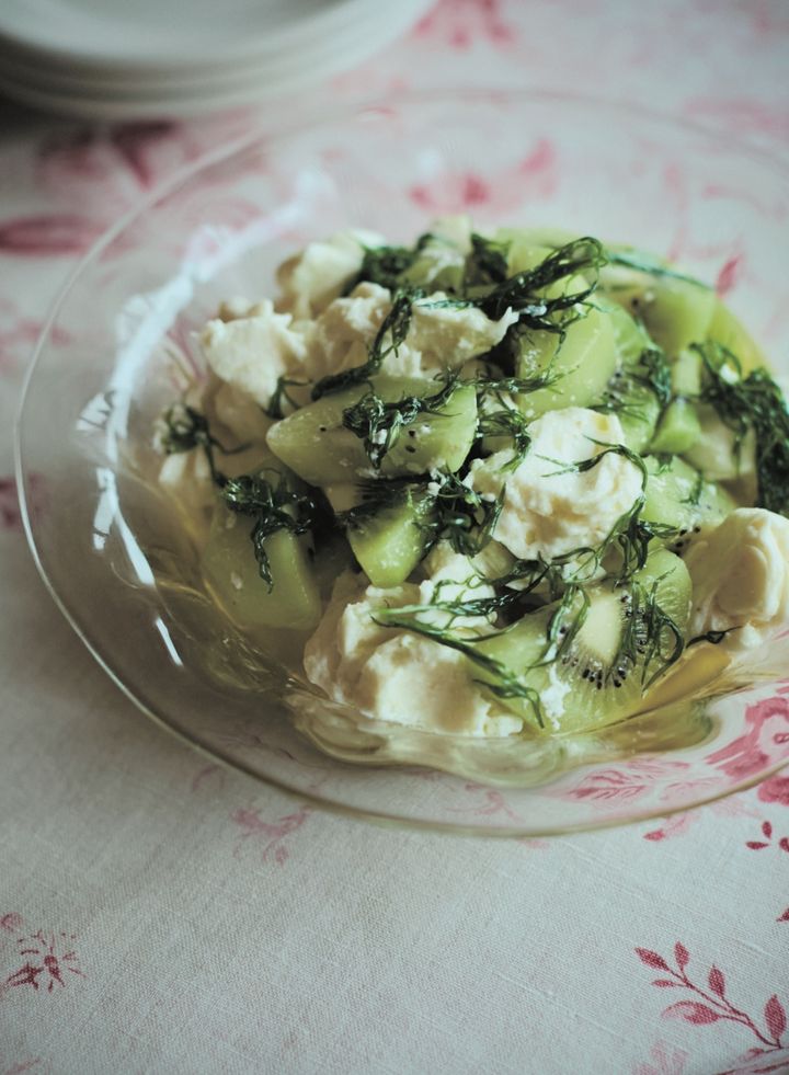 キウイは皮をむき、1㎝幅の半月切りにする。モッツァレラチーズは手でひと口大にちぎる。ディルは葉を摘む。