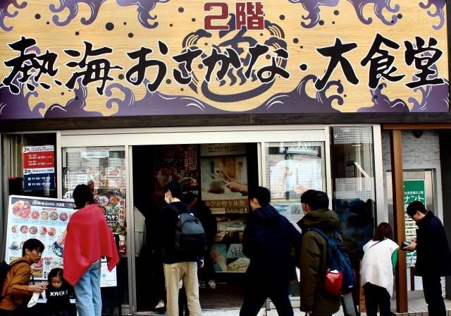 熱海駅にもどり、東京にもどる電車に乗る前に商店街巡りをしながら、ランチタイム。熱海といえば新鮮な海の幸! 行列のできる人気店、駅前商店街の「熱海 おさかな・大食堂」に直行。