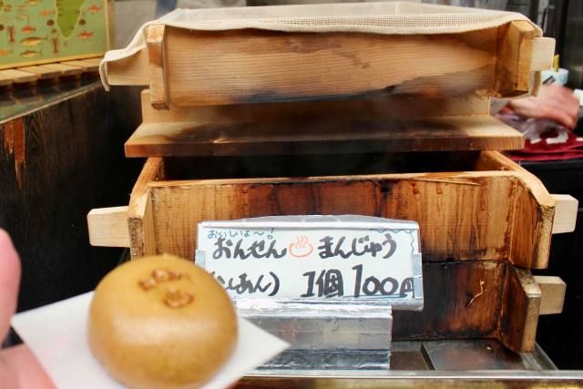 商店街には、温泉まんじゅうの店が軒を連ねます。まずは、蒸かしたてのほかほか温泉まんじゅう(100円)を一つ片手にそぞろ歩きをスタート。
