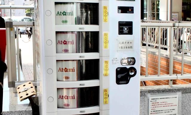 近くに備えられた自動販売機で100円のタオルを買うことも可能。熱海にある足湯には、ほぼタオル自動販売機が備えられているのが親切です。