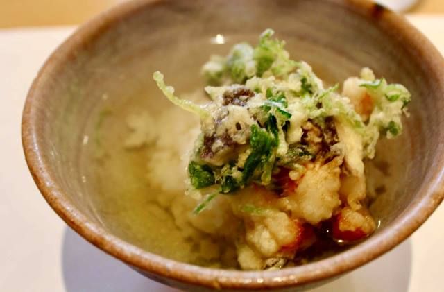 ビーチの前に立つホテルから町の中に歩いていき、江戸時代から続く、熱海で自社製造している数少ない干物屋さん、「釡鶴」初代の名を冠した天ぷら専門店でランチをとります。地の魚、野菜を中心に椿油と綿実油で軽く揚げた天ぷらは、サクサクで素材のそのものの味わいが格別。ランチの数量限定の「お刺身付き日替わり御膳」は3,000円。写真は7,000円コースの締めに出る天茶漬けです。ちょっと余裕があれば、こちらもおすすめです。