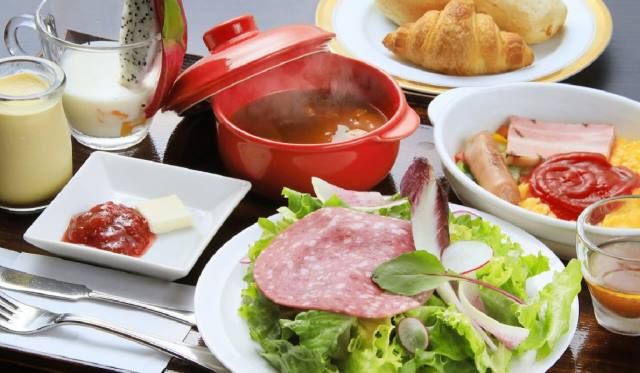 朝は、パティシェの経験を持つシェフによる静岡産の食材を使った野菜たっぷりのヘルシー洋朝食。手作りプリンとジャムが絶品です。