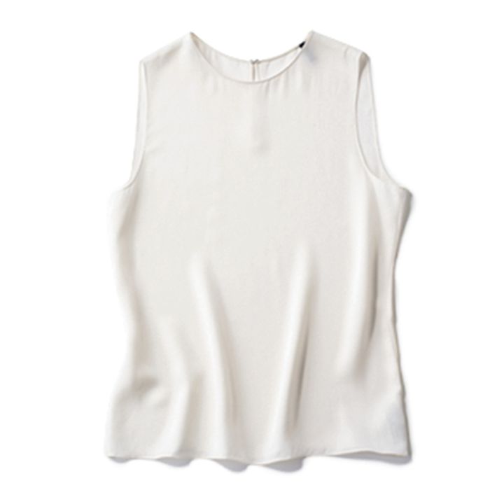 シルクのなめらかな光沢により、シンプルでありながらラグジュアリーな雰囲気に。インナー使いした時も、カットソーよりも上品な印象。トップス¥26,400(Theory)
