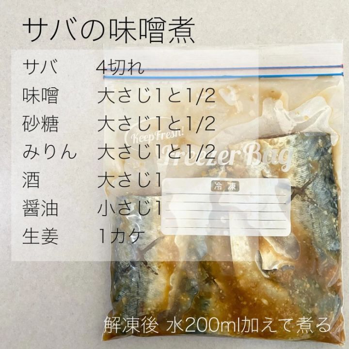 魚も時間のある際に下味冷凍しておけば、忙しいときにすぐできて助かります。煮魚はあまり好きではない子どもでも、サバの味噌煮は甘くて人気なレシピですよね。食べるときは、解凍後に水200mlを加えて煮てください。