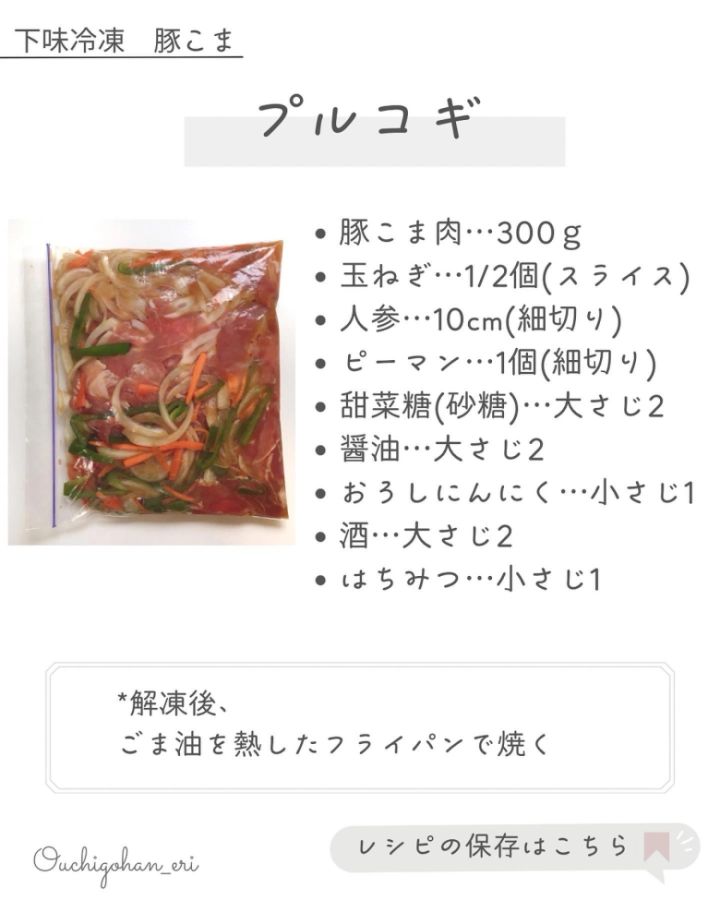 豚肉を使った下味冷凍のプルコギです。野菜もいっしょに冷凍して保存できるので、栄養もばっちり。食べるときは、解凍後にごま油で熱したフライパンで焼いてくださいね。