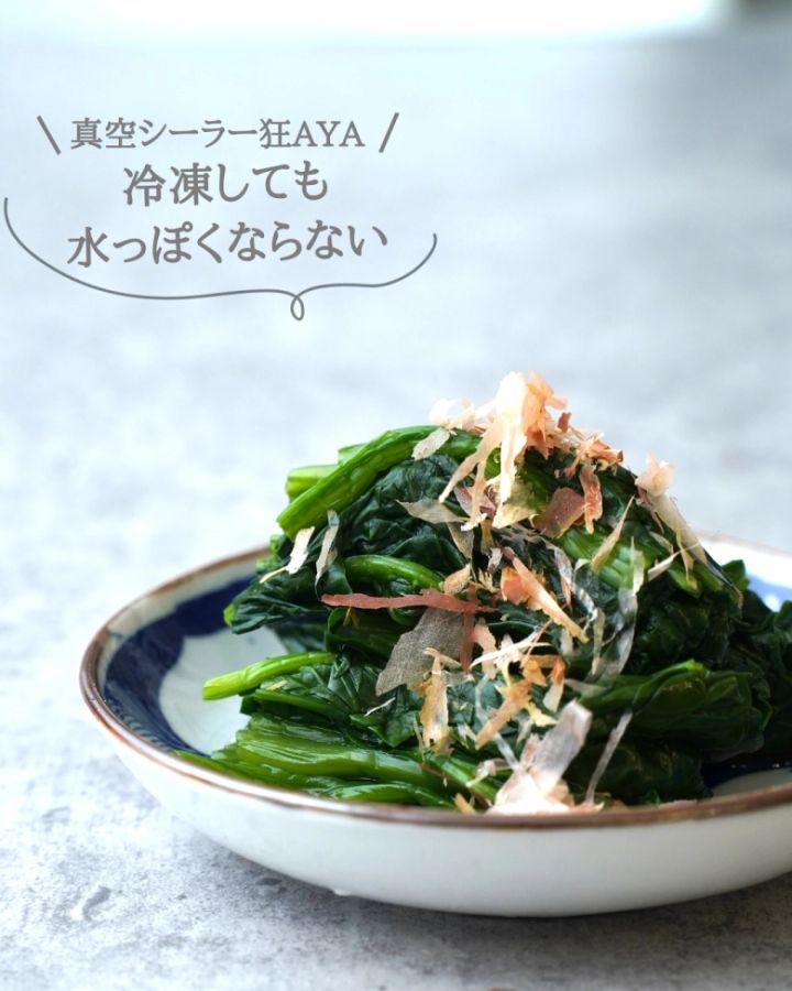 副菜の冷凍作り置きおかずに、ほうれん草のおひたしはいかがでしょうか。日持ちがしない生野菜の代わりに常備菜として冷凍ストックに入れておきたいメニューです。冷蔵庫で解凍して食べてくださいね。