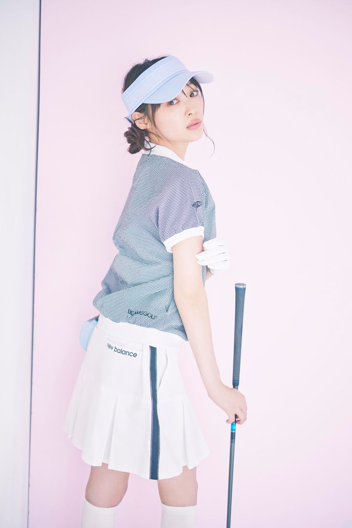 [スカートを着回し]シャツ¥17,600/ビームス ゴルフ バイザー¥4,950、ポーチ¥3,960/テーラーメイド シューズ¥29,700/ニューバランス ゴルフ グローブ¥3,740/キャロウェイ