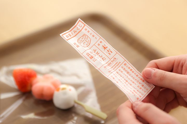 「くだもの串和菓子」には“菓子みくじ”も付いています。開運和菓子として、伝統的なお菓子のイラストが入ったおみくじです。運試しができる楽しさも魅力ですね。