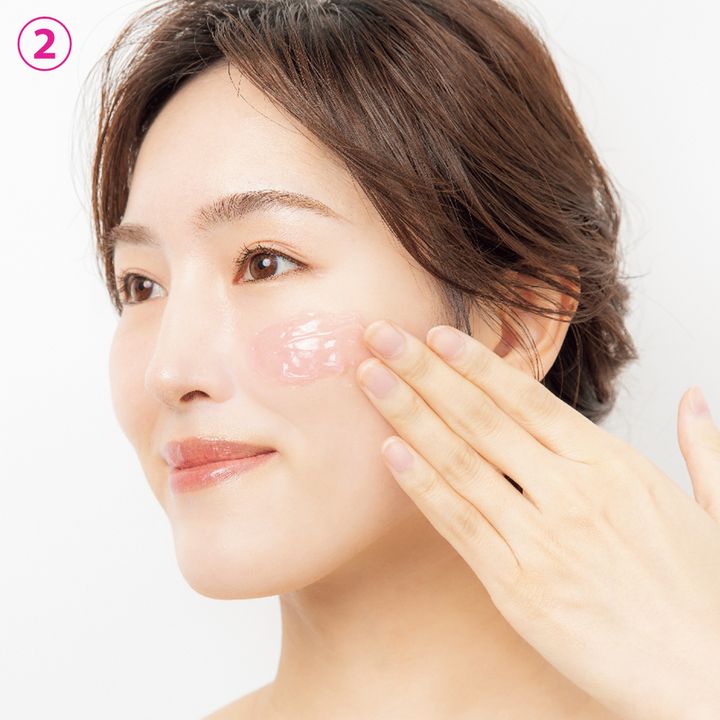 ②目周り・口元を避けて、顔全体と首元までやさしく塗布してください。