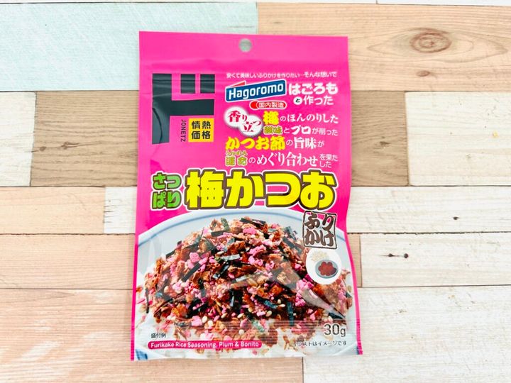 「さっぱり梅かつおふりかけ30g」の製造元は『はごろもフーズ』なのですが、同様のふりかけ商品と比べてもお値打ち価格。ほんのり梅の酸味と、サクサク香ばしいかつお節、いりごま、のりがブレンドされていますよ。