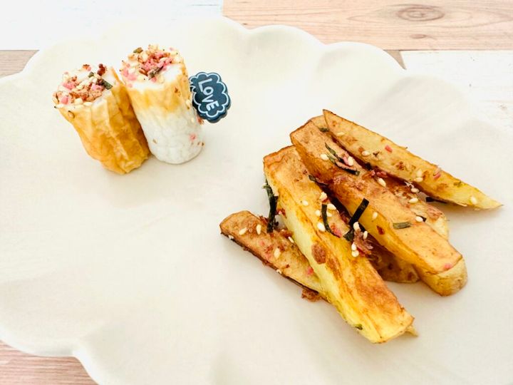 ふりかけなのでおにぎりや白飯にトッピングする方が圧倒的に多いと思いますが、シーズニングパウダーの一種として使うのもおすすめです。例えば、ちくわにきゅうりやチーズを詰めたおかずに、ふりかけをプラスしたり。フライドポテトに塩ではなく、ふりかけをまぶしたり。