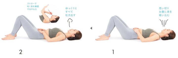 2、20~30秒かけて口から息を吐き出す。しっかりできているか分かりにくい場合は、ストローをくわえながら行うと呼吸しやすい。