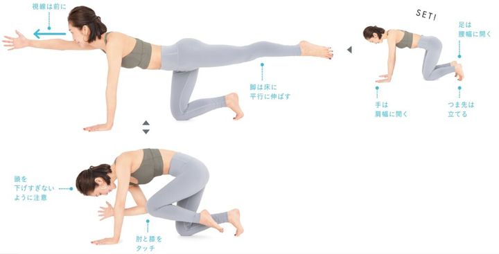 肩幅に手を開き、肩の真下に手をつく。足は腰幅に開いて、つま先を立てる。息を吸いながら、お尻の位置と同じ高さを意識して、右手を前に、左脚を後ろに伸ばす。息を吐きながら伸ばした手と脚を引き寄せて、右肘と左膝をつける。反対の手と脚も同様に行う。