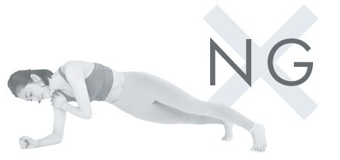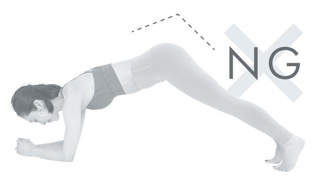 お尻が上がると、お腹に力が入りにくくなり、腹直筋に効かせにくくなる。お尻の位置はできるだけ床と平行になるような意識で。